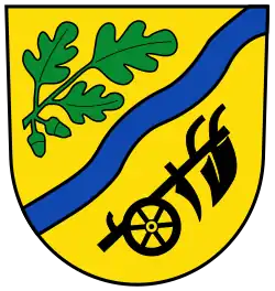 Blasonierung: „In Gold eine schräglinke blaue Wellenleiste; begleitet nach der Figur: oben von einem linksgewendeten, dreiblättrigen grünen Eichenzweig mit zwei Früchten; unten von einem schwarzen Pflug.“[2] |