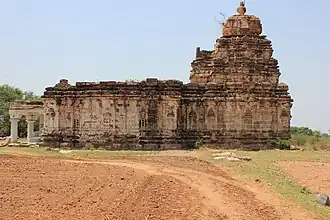 - Der etwas außerhalb des Ortes stehende Kalleshvara-Tempel gehört zu den frühen Bauten der Chalukyas von Kalyani; er wird in die erste Hälfte des 11. Jahrhunderts datiert und zeigt nur eine vergleichsweise einfache, d. h. nur wenig gegliederte (ratha) sowie figuren- und ornamentlose Außenansicht. Die Vorhalle (mandapa) ist zweigeteilt: ein offener Portikus mit kannelierten Säulen wurde wahrscheinlich im 18. oder 19. Jahrhundert hinzugefügt; die eigentliche Vorhalle wird nur durch die Tür sowie durch mehrere kleinere Steingitterfenster (jalis) belichtet. Die Seitenansicht zeigt deutlich die leicht aus dem gestuften Turmaufbau hervortretende antarala (in Südindien sukhanasi), in welcher sich die Treppenstufen zur erhöht liegenden fensterlosen Cella (garbhagriha) befinden. Diese ist im Innern nahezu quadratisch und äußerst schmucklos; das Äußere wird durch eine Art „Schirmkuppel“ mit aufsitzender kalasha-Vase dominiert.