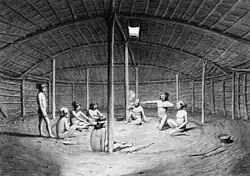 Die Praxis des Kults schloss elaborierte narrative zeremonielle Tänze und spezielle Insignien ein. Die Menschen der Stämme und Gruppen praktizierten Rituale, um Gesundheit, reiche Ernten und Jagden, Fruchtbarkeit und gutes Wetter zu sichern. Die Zeremonien schlossen eine jährliche Trauer-Prozedur, Übergangsriten und das Eingreifen von Geistwesen ein. Eine männliche Geheimgesellschaft traf sich in unterirdischen Tanz-Räumen und tanzte in Verkleidung bei öffentlichen Tänzen.[1][2]