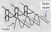 Die Maschine ist mit Spitzennadeln ausgestattet. Auf einer gradlinig verlaufenden Nadelbarre befestigt, können sich die Nadeln nur alle gemeinsam bewegen. Ein gestreckt über die Nadeln vorgelegter Faden wird zuerst mit Hilfe von Platinen kuliert, das heißt zu Schleifen vorgeformt (Zeichnung links). Im nächsten Schritt bilden Nadeln und Platinen in einer miteinander abgestimmten Bewegung eine Maschenreihe.