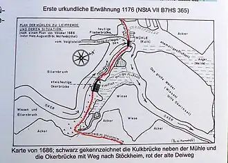 ![]() Historische Kartierung des Mühlenkulks in Leiferde auf einer Informationstafel der Heimatpfleger (Ausschnitt). | ||