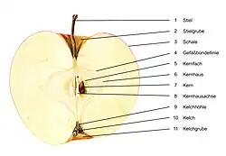 Apfelfrüchte sind das Verwachsungsprodukt von fünf balgfruchtartigen, meist zweisamigen Einzelfrüchten, die sowohl das pergamentartige Gehäuse als auch den Blütenbecher bilden. Letzterer wächst bei der Fruchtreife zum mächtigen, zuckerreichen (bis ca. 13 Prozent) Fruchtfleisch heran. Es erfolgt vor allem Verdauungsausbreitung durch den Menschen, dazu Schwimmausbreitung ganzer Äpfel und Bearbeitungsausbreitung z. B. durch Nagetiere. Die bekannte Braunfärbung der Schnittflächen eines Apfels wird durch die Oxidation des Polyphenols Chlorogensäure hervorgerufen. Reifende Äpfel produzieren das Gas Ethen, das die Reifung anderer Früchte in der Nähe fördert; dies kann auch zu deren vorzeitigem Verderb führen. Die Samen des Apfels befinden sich normalerweise in einer Samenruhe, d. h., sie werden erst keimfähig, wenn die unter der Samenschale befindlichen Hemmstoffe in einem feuchten Keimbett abgebaut sind.[11]