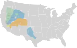 Das Hauptverbreitungsgebiet der Numic-Sprachen liegt im Großen Becken. Die Urheimat dieser Sprachen wird jedoch meist in den Wüsten Südkaliforniens gesehen, von wo aus sich die Vorfahren der Ute, Paiute und Shoshone vor ca. 2.000 Jahren rasch nach Norden und Osten ausbreiteten.[12] Eine Abspaltung der Shoshone, die Comanchen, konnte nach der Einführung des Pferdes durch die Europäer sogar bis auf die südlichen Plains vordringen, wo sie einer der mächtigsten Stämme wurden.