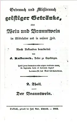 - J. Kalbersch: Gebrauch und Mißbrauch geistiger Getränke, oder Wein und Branntwein im Mittelalter und in unserer Zeit. 2. Theil: Der Branntwein. Diekirch 1854, 491 S.