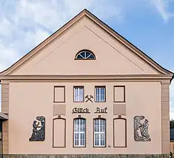 Mittig auf der großen Giebelwand befinden sich einige Kunstguss-Elemente, die zusammen ein Denkmal ergeben (siehe unten). Ein früher die beiden oberen Fensterreihen umfassender Balkon wurde nach 2017 abgetragen. Im dreieckigen Giebel befindet sich ein vierteiliges Halbrundfenster, ein Pendant ist auf der Westseite eingebaut. Auch im Ostgiebel ist ein solches Halbrundfenster, das die Form eines Stollenmundloches aufgreift, zu sehen.