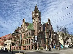 Es handelt sich um einen dreigeschossigen Ziegelbau, der zwischen 1898 und 1899 von Julius Otto Kerwien in Anlehnung an die mittelalterliche Backsteinarchitektur entstanden ist. Die u. a. mit glasierten Ziegeln und skulptierten Sandsteinelementen reich geschmückten Schaufassaden werden von einem ins Oktogon überführten, die Kreuzung zur Rudolf-Breitscheid-Straße beherrschenden Eckturm überragt.[1]