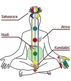Nach der tantrischen Lehre wohnt in jedem Menschen eine Kraft, die Kundalini genannt wird.[1] Diese befindet sich gemäß dem Tantrismus ruhend am unteren Ende der Wirbelsäule und wird symbolisch als eine im untersten Chakra schlafende, zusammengerollte Schlange dargestellt. Sie gilt als die der Materie am nächsten stehende Kraft im Menschen. Durch yogische Praktiken soll sie erweckt werden können und aufsteigen, wobei die transformierenden Hauptenergiezentren oder Chakren durchstoßen werden (Satchakrabedha „Sechschakrendurchstechen“). Erreicht sie das oberste Chakra, soll sie sich mit der kosmischen Seele vereinigen und der Mensch höchstes Glück erlangen.[2] Erst hier vereinigt sie sich nach tantrischen Lehren in ihrer transformierten Form mit den kosmisch-spirituellen Kräften. Da das Aufsteigen der Energie nach den klassischen Lehren auch Gefahren in sich birgt, sollen eine gute Vorbereitung und ein innerer Reinigungsprozess entscheidend sein, weshalb viele Schulen zuerst das Herzzentrum entwickeln. Es gibt immer wieder Fälle, die Tantriker als „spontanes Erwachen“ der Kundalini interpretieren.[3]