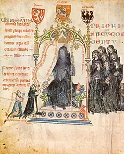 Das Passional der Kunigunde entstand zwischen 1312 und 1321 und ist eine Sammlung von geistigen Texten in lateinischer Sprache, die durch das gemeinsame Thema der Passion verbunden sind. Die Buchmalereien sind ein Beispiel höchster Kunstfertigkeit in ihrer Zeit und stammen vom Kanoniker und Schreiber Beneš. Mindestens zwei Texte verfasste der Dominikaner Kolda von Colditz.[1] Das Dedikationsbild zeigt Kunigunde auf einem Thron mit den Wappen Böhmens und der Přemysliden.