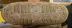 Die Kunst der Aborigines, englisch Aboriginal Art genannt, zählt zu „den ältesten kontinuierlichen Kunsttraditionen der Welt“.[1] Sie wird von indigenen Australiern, den Aborigines, geschaffen und umfasst einen Zeitraum von 40.000 Jahre alten Felsmalereien bis zu heutiger moderner Kunst, die auf ihrer traditionellen Kultur beruht. Dargestellt wurde zumeist figurativ die Tierwelt und Menschen sowohl für Lehr- als auch zeremonielle Zwecke. Bilder wurden auf Fels gemalt und geritzt, in Sand gezeichnet, auf Körper und Baumrinden gemalt. Die Kunst der Aborigines umfasst ein weites Spektrum an Medien, einschließlich das Bemalen von Rindenplatten, Leinwand, Holz- und Steingravuren, Bildhauerei, Sand- und Körpermalerei, das Erstellen von zeremoniellen Kleidungsstücken und die künstlerische Verzierung von Waffen und Werkzeugen.