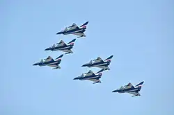 Das 1. August Kunstflugteam (Ba Yi Kunstflugstaffel) war zunächst ausgestattet mit Shenyang JJ-5-Strahltrainern, einer chinesischen Version der sowjetischen MiG-17, die durch die neueren Chengdu J-7EB ersetzt wurden. Diese wiederum wurden 2001 durch die neueren Chengdu J-7GB ersetzt. Seit Mai 2009 wird das moderne Mehrzweckkampfflugzeug Chengdu J-10 verwendet, ab 2023 in der neuen C-Variante.[2] Es gibt etwa acht Flugzeuge in der Flotte, aber nur sechs werden für die Vorführungen bei den Airshows eingesetzt. Die Zusatztanks sind farblich an den Anstrich der Vorführflugzeuge angepasst.