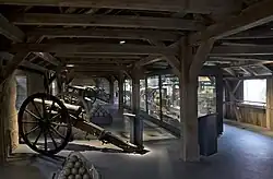 Die Sammlung historischer Waffen umfasst etwa 10.000 Objekte und teilt sich in militärische, jagdliche und höfische Waffen.[4][10] Der militärische Bestand geht zum Teil unmittelbar auf die Zeughäuser der Veste sowie der Stadt Coburg zurück. Zu den ältesten Stücken zählen Eisenschwerter des 9. und 11. Jahrhunderts sowie Holzschilde des 15. Jahrhunderts. Herausragend hinsichtlich Vielfalt, Qualität und Erhaltungszustand ist der große Bestand an Feuerwaffen. Dieser reicht von spätmittelalterlichen Brandpfeilen und Hakenbüchsen bis zu Feldgeschützen des 19. Jahrhunderts.[38][39] Zahlreiche Belagerungs- und Verteidigungswaffen stammen aus der Zeit des Dreißigjährigen Kriegs, darunter auch besonders rare Objekte wie Handgranaten, Pechkränze, Leuchtbomben etc.