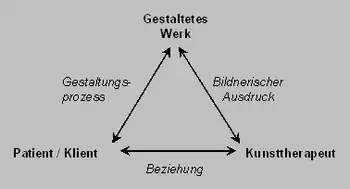 Die Kunsttherapie unterscheidet sich von anderen Therapieformen dadurch, dass zu der Beziehung Patient – Therapeut ein Drittes hinzutritt: das künstlerische Medium. Daraus ergibt sich zwischen den Beziehungspunkten Klient – Therapeut – Medium (Werk) ein Beziehungsdreieck, das in der kunsttherapeutischen Literatur als kunsttherapeutische Triade bezeichnet wird.[34] Damit spielen für die kunsttherapeutische Praxis drei Ebenen und ihre Beziehung zueinander eine Rolle: das künstlerische Gestalten am Werk, die Beziehung zwischen Therapeut und Patient sowie die Betrachtung des Werkes und seine Wirkung.[35] Hierdurch ergibt sich eine komplexe Anzahl an Interaktionskonstellationen. Das Werk selbst erhält eine mehrdimensionale Bedeutung sowie die Funktion eines kommunikativen Dritten, das durch den Klienten selbst geschaffen wird und real wahrnehmbar ist.[36]