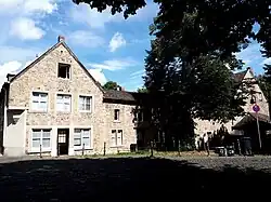 Auffallend ist an dem nach alten Plänen wiederhergestellten Herrenhaus vor allem dessen kunstvoll ausgeführte Eingangstür, in dessen Türumrahmung oberhalb des Durchgangs ein ovales, aus Blaustein gefertigtes und mit einem schmiedeeisernen Gitter verziertes Ochsenauge eingebaut ist, das den barocken Stil der Anlage betont. Die kräftige Holztür ist mit zwei vertikal-rechteckigen Bleiglasfenstern ausgestattet, die ebenfalls mit schmiedeeisernen Gittern bestückt sind, auf denen wiederum die farblich betonten Wappen der Familien Peltzer und Prym dekorativ angebracht sind.
