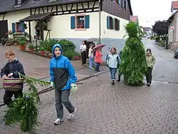 Ursprünglich im ganzen Landkreis Rastatt heimisch, hat sich dieser Brauch nur noch im Stadtteil Oberndorf erhalten. Er geht zurück auf die Sage von Pfingstkönig und -königin, welche vom Pfingstträg begleitet wurden. Dieser war ein fauler und Erbsen liebender Gesell, der vor lauter Gier nach den grünen Hülsenfrüchten stets zu spät zum Einzug des königlichen Paares erschien und dabei immer sein Pferd vergaß. Daher lautet der Spottspruch auf ihn: