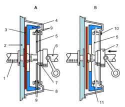 Zum Lösen wird die Membranfeder, die mit ihrem äußeren Rand über die Topfscheibe auf die Kupplungsscheibe drückt, „abgehoben“, indem sie an ihrem inneren Rand axial verspannt wird. Der Ausrückring (7) wird mit Fußkraft vom Kupplungspedal aus gegen die Membranfeder gedrückt, die sich umstülpt (Verdrehen um die Stützlager (10)/(11)). Die Topfscheibe entfernt sich etwas von der Kupplungs- und der Schwungscheibe.