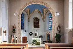 Die Glasfenster im Chor und der Tabernakel sind nach einem Entwurf von Mila Bjelik-Stöhr aus 1948. Die Holzreliefs Verkündigung und Heilige Familie aus den Jahren 1950 und 1952 sind von Käthe Sinz. Die Kreuzwegstationen in Fresko wie auch ein Wandbild Erzengel Michael in Fresko beim Kriegerdenkmal sind von Andreas Amann aus dem Jahre 1949.