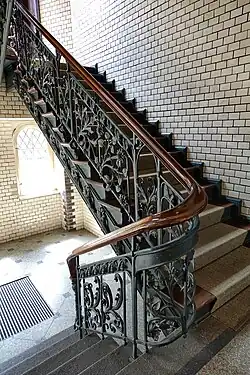 Die Spreeseite enthält im Erdgeschossbereich Rundbogenfenster in zwei verschiedenen Breiten, unterbrochen durch ein großes Tor, das die gewölbte Zufahrt zum Hof verbirgt.[4] Die Hofbauten sind teilweise, wie im 19. Jahrhundert bei Industriegebäuden üblich, mit weißen kleinen Kacheln vollflächig verkleidet.