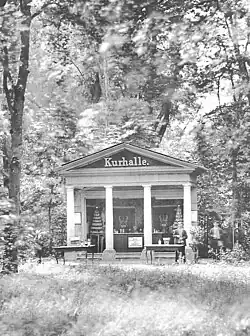 Das Bauwerk wurde im Jahr 1808 als Kurhalle im Theresienhain errichtet. Heute wird es als Ruhetempel bezeichnet.