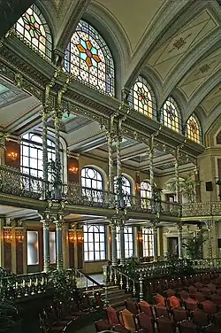 Im Innenraum wird das einfallende Tageslicht durch bunte Fensterglasscheiben gefiltert. Dabei entsteht ein Raumeindruck ähnlich dem in Bauten Ludwig II. Auch die innen verbauten aufwändig ornamentierten Säulen, Brüstungen, Fenster und die Deckenkonstruktion waren vorgefertigte Katalogteile. Die Farben und Goldfassungen wurden jedoch individuell vom Bauherrn und Architekt festgelegt.