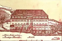 Die Grundsteinlegung erfolgte am 14. April 1914 direkt nach Ostern „unter der Teilnahme von mehreren Hundert Lehrern“[11]. Durch den Ausbruch des Ersten Weltkrieges verloren freizeitlich orientierte Aktivitäten an Bedeutung, die Fertigstellung des Kurhauses verzögerte sich um Jahre.[12] Als Mansardwalmdachbau im Heimatstil errichtet, bestand das Untergeschoss aus behauenen Bruchsteinen, die übrigen Geschosse aus verputzten Backsteinen. Die Haustechnik war mit einer Zentralheizung inkl. Warmwasserversorgung und doppelt verglasten Fenstern für die damalige Zeit fortschrittlich.