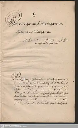 Beispiel: Der Herzog von Sachsen-Weimar adressierte den Fürsten von Kaunitz-Rietberg nicht mit der ihm zukommenden Anrede Durchlauchtig Hochgeborener Fürst, sondern mit der höheren Anrede Durchlauchtiger Fürst, vermutlich deshalb, weil es sich bei dem Angesprochenen um den mächtigen österreichischen Staatskanzler Wenzel Anton von Kaunitz handelte.[8][9]