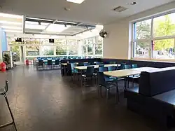 Die Schule verfügt über eine anliegende Mensa, in welcher ca. 90 Personen Platz finden. Zudem kann man an warmen Tagen auch draußen sitzen. Es gibt einen Wasserspender zum kostenlosen Gebrauch und die belegten Brötchen und Backwaren der Mensa stammen aus eigener Produktion.[10]