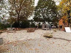Das grüne Klassenzimmer liegt auf dem Schulhof neben dem Spielplatz und besteht aus sechs Tischbänken. An heißen Tagen kann der Unterricht auch dort stattfinden.[11]