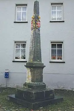 Die Distanzsäule besteht aus sieben Teilen. Sockel, Postament und Postamentbekrönung bilden den Unterbau. Der Oberbau besteht aus Zwischenplatte, Schaft, Wappenstück und Spitze.