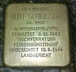 Am 3. Dezember 1943 kam es zur Verhaftung von Kurt Schlosser und weiteren aktiven Antifaschisten. Am 30. Juni 1944 wurde er vor dem 2. Senat des Volksgerichtshofes zusammen mit Herbert Blochwitz, Otto Galle und Arthur Weineck wegen „Hochverrats und Feindbegünstigung“ zum Tode verurteilt und am 16. August 1944 im Richthof des Dresdner Landgerichtes Münchner Platz enthauptet.