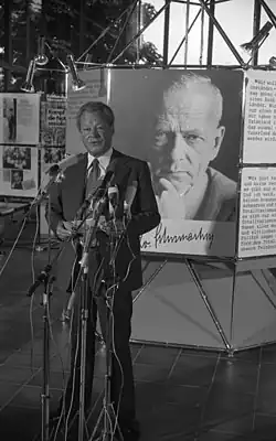 1949 kandidierte Schumacher bei den Wahlen zum Amt des Bundespräsidenten, unterlag aber dem FDP-Kandidaten Theodor Heuss, der auch von den Unionsparteien mitgetragen wurde.[12] Diese Kandidatur Schumachers war aber nicht im Sinne eines Rückzuges aus der aktiven Politik hin zur Übernahme einer repräsentativeren Aufgabe zu verstehen. Indem er sich selbst zur Wahl stellte, beugte Schumacher immer lauter werdenden Forderungen aus Koalitionskreisen vor, einen SPD-Politiker an die Spitze des Staates zu wählen.