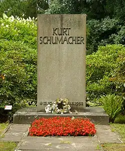 Schumacher war Kettenraucher und erlitt 1951 einen Schlaganfall. Am 20. August 1952 starb der schwerkranke Politiker im Alter von 56 Jahren in Bonn.[13] Beigesetzt wurde er in Hannover auf dem Stadtfriedhof Ricklingen in einem Ehrengrab. An den Straßen zwischen Bonn und Hannover standen hunderttausende Menschen und erwiesen ihm die letzte Ehre. Die Süddeutsche Zeitung schrieb in ihrem Nachruf: „Wir brauchen Dich, obwohl Du unser Gegner bist, und wir wissen es. […] Und das weitere Tröstliche ist darin enthalten, daß es hier keiner mittelmäßigen und mittellauwarmen Persönlichkeit entgegenwallte, keinem ‚Wirte wundermild‘, sondern einem Strengen, Abweisenden, Unerbittlichen.“