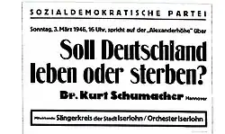 Unmittelbar nach Kriegsende und der Befreiung Deutschlands vom Nationalsozialismus begann Kurt Schumacher mit dem Wiederaufbau der SPD. Wie August Bebel wurde Schumacher als wahrer Volkstribun, mitreißender Redner, Führer, an den glaubte, wer zur SPD gehörte (Peter Lösche) beschrieben. Seine Genossen spornte er immer an weiterzumachen, auch wenn es sich nicht mehr zu lohnen schien. Zur Jugend in der SPD hatte er ein gutes Verhältnis; diese bewunderte ihn wegen seiner strikten Ablehnung des Nationalsozialismus.