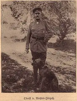 „Am 27. November 1935 verstarb in Karlsruhe, 73 Jahre alt, wenige Monate nach seiner ihm im Tode vorangegangenen Gattin, der Generalmajor a. D. Kurt v. Wahlen-Jürgaß. Ritter beider Eisernen Kreuze, des Kronenordens II. Kl. u. a. h. Orden. Mit ihm verlieren wir Königs-Infanteristen unseren hochgeschätzten letzten Friedenskommandeur und heldenhaften Regiments- und Brigadekommandeur im Kriege. … Am 27. September 1862 zu Breslau geboren, tritt v. Wahlen-Jürgaß im April 1879, noch nicht siebzehnjährig, als char. Portepee-Fähnrich in das Infanterieregiment 47 ein, 1894 ist es Brigade-Adjutant, anschließend Kompaniechef im Regt. 97 und Grenadier-Regt. 110. Die weitere militärische Laufbahn führte den 1908 zum Major Beförderten im Jahre 1912 ins badische Leib-Grenadier-Regt. 109 nach Karlsruhe, wo er bald als Oberstleutnant aufrückte. Am 4. Juli 1914 wird v. Wahlen-Jürgaß Oberst und Kommandeur unseres Königs-Regimentes. Als solcher rückt er einen Monat später an der Spitze unserer Bataillone in den Krieg. Was der Vollendete als Regimentskommandeur und vom Oktober 1915 als unser Brigadekommandeur geleitet hat. … Bald nach Kriegsende warf ihn unheilbare Krankheit aufs Lager. … Nun ist er der Krankheit erlegen, der auch Kaiser Friedrich erlag. …“