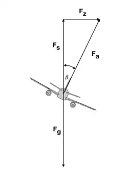 Um ein Flugzeug eine Kurve mit dem Radius fliegen zu lassen, muss das Flugzeug in Richtung Kurvenzentrum mit der Beschleunigung zentripetal beschleunigt werden. Um diese Beschleunigung zu erreichen, muss auf das Flugzeug der Masse eine zentripetale Kraft wirken. Diese Kraft wird mit dem Auftrieb der Flügel geschaffen, indem das Flugzeug in Richtung Kurvenzentrum gekippt wird. Der Auftrieb der Flügel wird beim Neigen des Flugzeuges vektoriell in eine senkrechte und in eine zentripetale (horizontale) Komponente geteilt. Die senkrechte, nach oben wirkende Komponente ist dem Gewicht des Flugzeuges entgegengerichtet und hat denselben Betrag wie das Gewicht: . Mit dem Flugzeug-Neigungswinkel (englisch bank-angle genannt) wird die zentripetale Kraft betragsmäßig