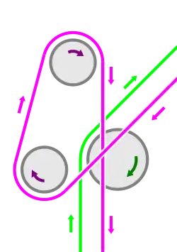 Da Berg- und Talfahrt nicht parallel verlaufen, wird an Tal- und Bergstation das Seil um weniger als 180° umgelenkt, was die Abspannung des Seiles komplizierter macht. Gewöhnlich bewegt sich die Umlenkscheibe nach vorne und hinten, um das Seil stets gespannt zu halten. Wenn nun berg- und talfahrendes Seil aber nicht mehr genau parallel zueinander stehen, würde das Seil aus den Führungsrollen bei der Umlenkscheibe springen, wenn diese eine größere Bewegung vollzieht. Daher kommen in der Spannstation drei Umlenkscheiben zum Einsatz, von denen nur die mittlere beweglich ist. Die anderen beiden halten das Seil stets in der gleichen Position und verhindern die Entgleisung des Seils.[2] Bis heute ist dieses Prinzip weit verbreitet. Da mehr Stützen benötigt werden als gewöhnlich, ist der Materialaufwand höher.
