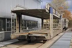Kurzkupplungsende zwischen zwei Teilen eines Autotransportwagens ohne Zughaken und mit einseitig angeordneten Puffern
