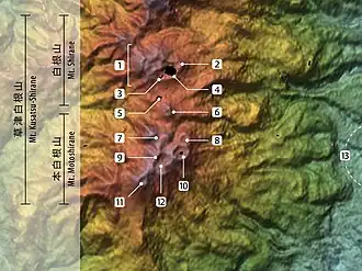 Zwei Kilometer südlich des Shirane-Hauptkegels liegt der 2171 m T.P. (36° 37′ 22,5″ N, 138° 31′ 54,2″ O) hohe Aschekegel Motoshirane (本白根山 -san, deutsch ‚ursprünglicher Shirane‘). Dessen nordwestlicher Krater ist der Kratersee Kagami-ike (鏡池 ‚Spiegelteich‘; 36° 37′ 25″ N, 138° 32′ 20″ O).