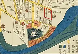 - ↑ Ausschnitt aus der Stadtteilkarte „Shibaguchi-minami“ von ca. 1850.