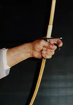 Die asymmetrische Form des Bogens und das Anliegen des Pfeils an z. B. der rechten Seite würden den Pfeil beim Lösen nach rechts oben ablenken. Um dieses auszugleichen, muss der Bogen beim Abschuss innerhalb eines Sekundenbruchteils zum Ziel gedreht/geschraubt werden (Tsunomi no hataraki), bevor sich der Pfeil von der Sehne löst. In Koordination mit der Bewegung der linken Hand muss die rechte Hand nach innen eingedreht werden (Hineri), damit der Handschuh die Sehne freigibt.