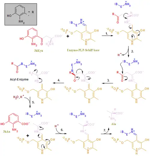 L-Alanin wird durch Hydrolyse von 3-Hydroxy-L-Kynurenin abgespalten und es entsteht 3-Hydroxyanthranilat.