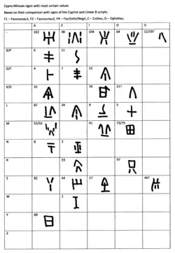 Die kypro-minoische Schrift (auch altkyprische Schrift oder Linearschrift C, kurz: CM) ist ein Schriftsystem, vermutlich eine Silbenschrift, das im bronzezeitlichen Zypern etwa vom 15. bis 12. Jahrhundert v. Chr. benutzt wurde. Einzelne Funde stammen auch aus Ugarit und Latakia (beide im heutigen Syrien), Tiryns (Griechenland, bisher drei Inschriften)[3] sowie aus Cannatello[4] (auf Sizilien). Sie entstand aus der minoischen Linearschrift A und bildete den Vorgänger der kyprischen Schrift. Sie wird in drei nah verwandte Schriftsysteme (CM I, CM II und CM III) aufgeteilt; dazu kommt noch eine archaische Variante, die der Linearschrift A sehr nahesteht. Die Einheit von CM I wird jedoch in jüngerer Zeit stark angezweifelt.[5] Durch Vergleiche mit lesbaren verwandten Schriften (Linear B, kyprische Schrift) lassen sich zwar fast 50 Silbenzeichen mit einer gewissen Sicherheit bestimmen, doch sind die Texte weitgehend unverständlich, da die zugrundeliegende kypro-minoische Sprache, wahrscheinlich ein Vorläufer der eteokyprischen Sprache, noch unverständlich ist. Insgesamt hat die Schrift 114 Zeichen, 24 Zeichen kommen in allen drei Schriftsystemen vor.[6] Das Textcorpus besteht hauptsächlich aus vermutlich literarischen Texten auf gebrannten Tontafeln, Votivinschriften (?), fünf Tonzylindern unbekannter Funktion, kleinen Tonbullen und sonstigen Inschriften unbekannter Funktion.