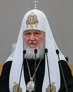 Ende März 2024 bezeichnete Patriarch Kyrill I. auf der Sitzung des Weltkonzils des Russischen Volkes den russischen Angriffskrieg auf die Ukraine als „Heiliger Krieg“. Das Konzil verabschiedete ein entsprechendes Dokument, in dem die russische Invasion der Ukraine als „Heiliger Krieg“[62] bezeichnet wurde, mit dem Ziel, „die Welt vor dem Ansturm des Globalismus und dem Sieg des dem Satanismus verfallenen Westens zu schützen“ („protecting the world from the onslaught of globalism and the victory of the West, which has fallen into Satanism“).[62] Außerdem hieß es, dass nach dem Krieg „das gesamte Gebiet der modernen Ukraine in die Zone des ausschließlichen Einflusses Russlands übergehen sollte“ („the entire territory of modern Ukraine should enter the zone of Russia's exclusive influence“).[63] Schließlich bezog sich das Dokument auf eine „Dreieinheit des russischen Volkes“ („triunity of the Russian people“) und forderte, dass Weißrussen und Ukrainer „nur als subethnische Gruppen der Russen anerkannt werden sollten“ („should be recognised only as sub-ethnic groups of the Russians“).[63]