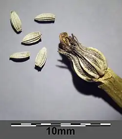 Die Achäne ist bei einer Länge von etwa 1,5 Millimetern abgeflacht verkehrt-eiförmig, fünfkantig, zehnrippig, mit Rippen, die am oberen Ende manchmal in kleine Zähne auslaufen und zwischen den Rippen warzig gerunzelt sind.[2] Ein Pappus fehlt.[2]