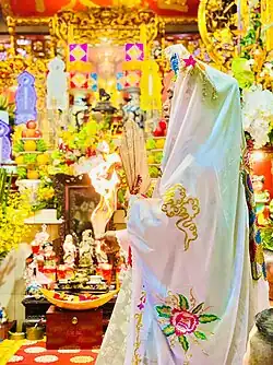 Das Pantheon der Götter und Geister bildet das „Gerüst“ jenes religiösen Weltbildes, das als Religion der Vier Paläste (Đạo Tứ Phu) oder als Religion der Muttergottheit (Đạo Mẫu) bezeichnet wird. In einer Art nostalgischer Reminiszenz an die große imperiale Vergangenheit treffen in hierarchischer Reihenfolge Geister-, Kultur- und Ahnen-Heroen zusammen. Im Laufe eines bis zu acht Stunden dauernden lên đồng-Rituals verkörpert ein Medium mehrere Dutzend Geister. Wenn ein Geist das Medium „besteigt“, werfen die Assistenten (hầu dâng) ein rotes Tuch über den Kopf des Mediums und kleiden es anschließend mit speziellen, den Geistern zugeordneten Roben ein. Das Medium verliert mehr oder weniger die Kontrolle über dessen Körper und erlaubt somit dem Geist die Besetzung bzw. den „Auftritt“. Während des Rituals spielen chầu văn-Musiker die Mondlaute, verschiedene Perkussionsinstrumente, die Zither und die Bambusflöte in einprägsamen Rhythmen, Melodien und Gesängen.[1]