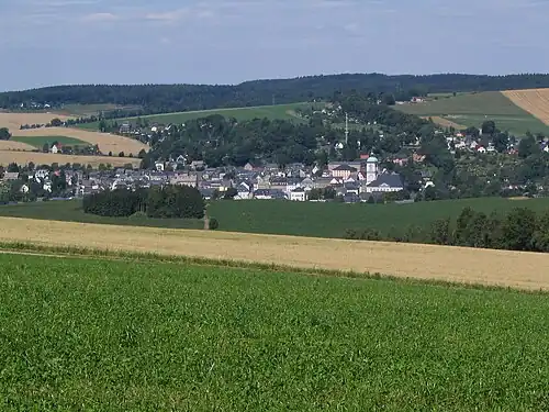 Die Bergstadt Lößnitz (von altsorbisch Lěśnica für Waldbach)[2] im Erzgebirge, auf Grund des Alters auch Muhme genannt, ist eine Stadt im Erzgebirgskreis, Sachsen, Deutschland und gehört zum Städtebund Silberberg.