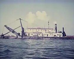 Ein Löffelschwimmbagger (englisch: dipper dredger) ist ein Schwimmbagger, der mit einem am Ausleger montierten Löffel Boden vom Gewässergrund aufnimmt. Die Maschine arbeitet diskontinuierlich und eignet sich besonders für punktuelle Baggerarbeiten, bei denen eine hohe Reißkraft erforderlich ist. Je nach Ausführung kann sowohl feinkörniges Material wie Sand oder Kies als auch grobes Baggergut wie Feldbrocken aufgenommen werden.[1] Aufgrund der horizontal wirkenden Grabkräfte werden sie häufig während des Einsatzes auf dem Gewässergrund abgestützt, um ein stabiles Arbeiten ohne Schwanken zu ermöglichen.