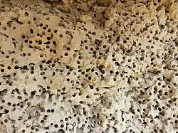 Löss (Hauptschreibweise) oder Löß ist ein homogenes, ungeschichtetes, hellgelblich-graues Sediment, das vorwiegend aus Schluff besteht. Häufig wird daneben ein gewisser Karbonatanteil als wichtiges Kriterium zur Charakterisierung angesehen.[1] Löss wurde überwiegend von Wind abgelagert, verändert sich danach aber meist weiter.