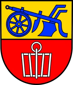 Die Blasonierung lautet: „Geteilt, oben in goldenem Feld ein blauer Pflug, unten in rotem Feld ein silberner Rost“.