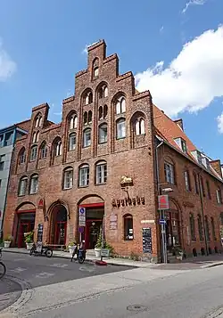 - ↑ Joachim Niendorf: 150 Jahre Löwen-Apotheke in Lübeck 1812–1962. 48 Seiten, unpaginiert, Eigenverlag, Lübeck 1962: Erst durch spätere Neunummerierung erhielt das Haus die Nr. 13.