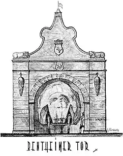 Eine Bleistiftzeichnung des Bentheimer Stadttores von 1853, als Anlage zu einem Gutachten des Wegebauinspektors Heinrich Wischer aus Meppen über Nordhorns Stadttore erstellt, zeigt die im Bentheimer Stadttor verbauten Sandsteinlöwen.[2] Wischer empfahl bereits damals, das Stadttor zu beseitigen: